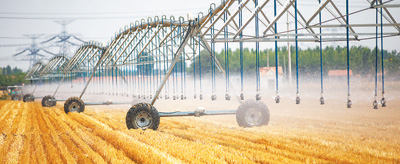 ??6月17日,在山東省東營市廣饒縣李鵲鎮前艾家村的田地里,農民正在使用桁架式噴灌機澆地。劉云杰攝(人民視覺)