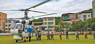 ??6月17日,廣東省梅州市平遠縣體育場,直升機在運送救援物資。馮錫權攝(人民視覺)