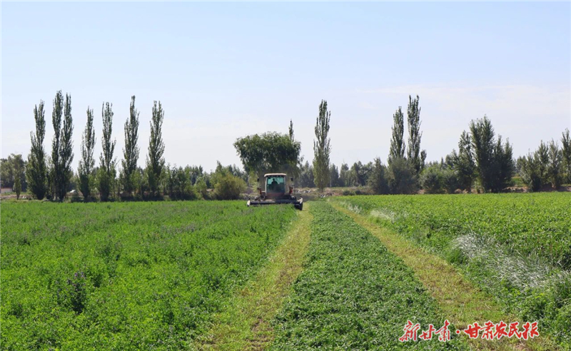 伴隨著轟鳴聲,大型收割機正有序作業,機器所到之處,原本茂密的苜蓿整齊地倒下,整片的苜蓿地從“綠地毯”變成了帶有收割痕跡的“條紋毯”。收割后的苜蓿經過2到3天的晾曬后被打包成高品質干草,成為牛羊等畜禽“膘肥體壯”的營養佳肴。