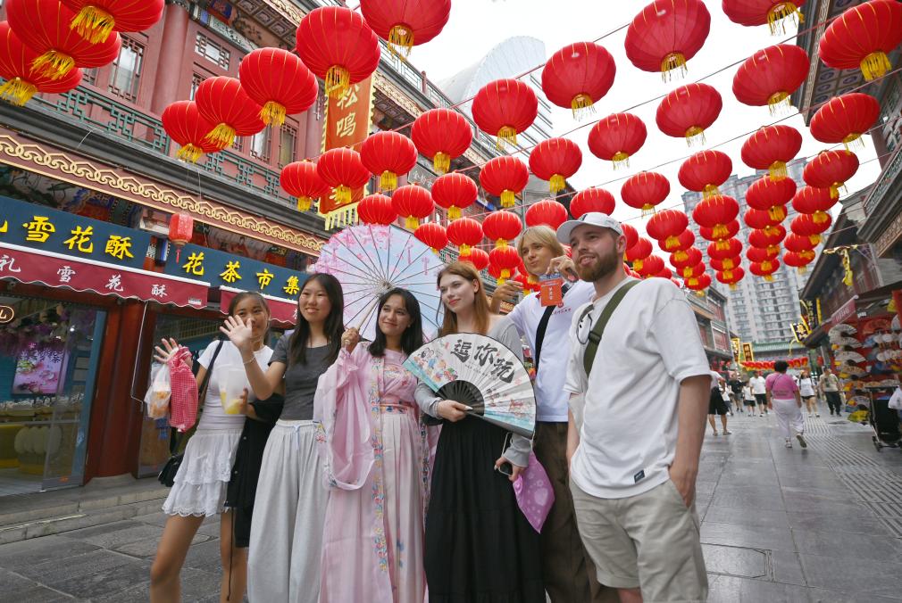??8月14日,上合組織國(guó)家學(xué)生在天津古文化街留影。新華社記者李然攝
