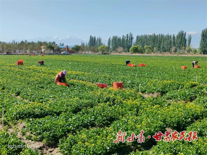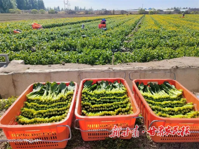 甘肅農(nóng)民網(wǎng)訊 近日,走進肅州區(qū)總寨鎮(zhèn)千畝高原夏菜種植基地,一片片綠油油的菜心青翠欲滴、長勢喜人,青青菜園里人頭攢動,工人們將菜心采割、分選、分級、預(yù)冷、裝箱……總寨鎮(zhèn)西店村第一茬露地高原夏菜上市了!