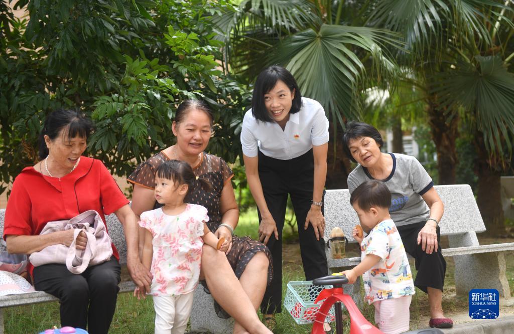陸秀興(右三)和佛山市禪城區張槎街道古灶村村民在一起聊天(2022年9月7日攝)。新華社記者 盧漢欣 攝
