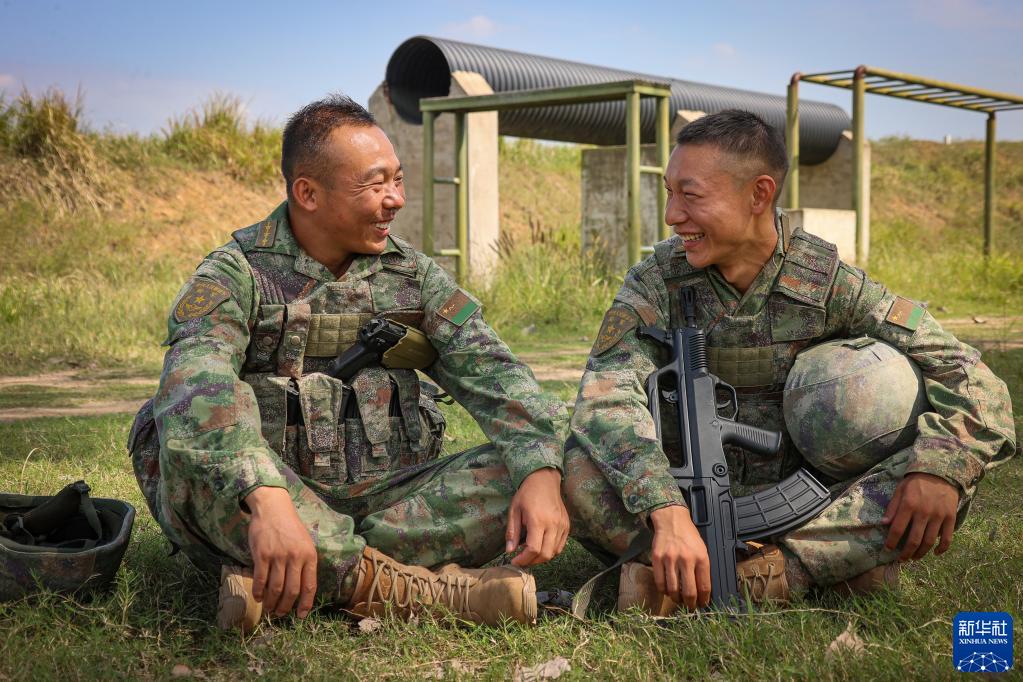 陸軍第71集團軍某旅“濟南英雄連”連長孫金龍(左)在訓練結束后與戰士談心(2022年9月22日攝)。新華社發(黃振宇 攝)