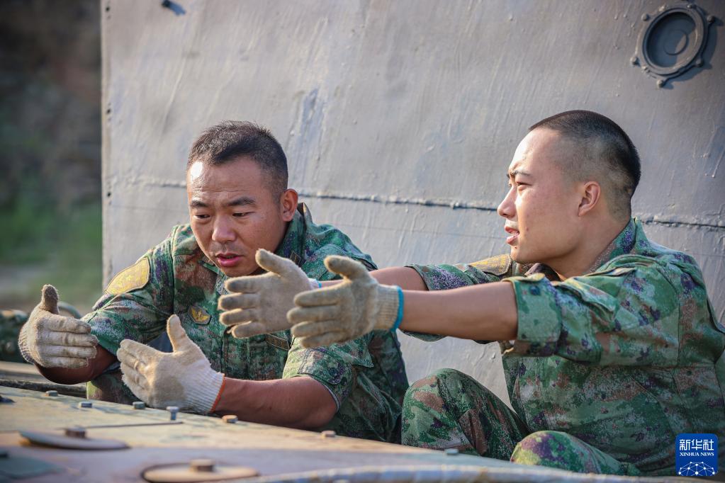 陸軍第71集團軍某旅“濟南英雄連”連長孫金龍(左)向步戰車駕駛員請教專業知識(2022年9月18日攝)。新華社發(黃振宇 攝)